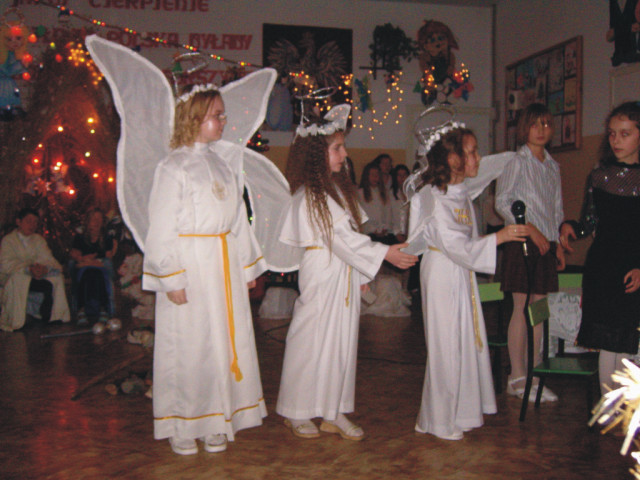 Zebranym rodzicom, nauczycielom i gościom uczniowie z Raczyn zaprezentowali wigilijne jasełka, nasze tradycje świąteczne i wspólne kolędowanie. Burmistrz Zbigniew Nosek złożył wszystkim życzenia świąteczne i zaprosił uczniów występujących w przedstawieniu na uroczystą Sesję Rady Miejskiej, która odbędzie się w dniu 30 grudnia 2004 roku.