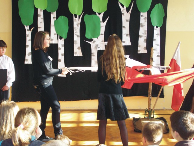 Szkolni aktorzy z klas: IV b, V c i VI b przypomnieli zebranym w sali gimnastycznej uczniom i nauczycielom daty i wydarzenia historyczne, które doprowadziły do wolności. Nadeszła ona dopiero po 123 latach niebytu Ojczyzny na mapie Europy. Widzowie w skupieniu słuchali wierszy i piosenek patriotycznych. Zadumali się nad przeszłością narodu i państwa polskiego ...