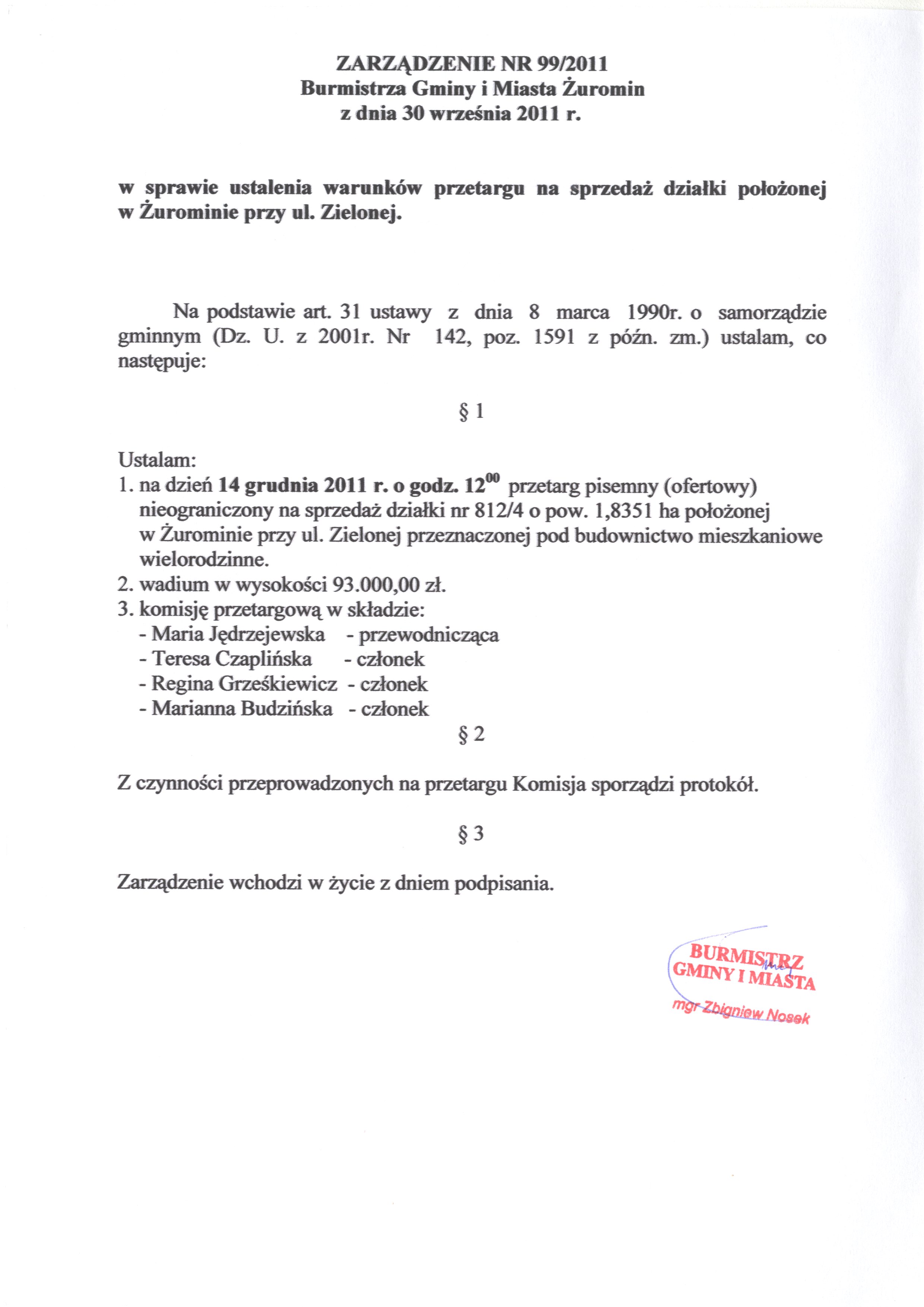 Zarządzenie Nr 99/2011 z dnia 30.09.2011 Burmistrza Gminy i Miasta Żuromin w sprawie ustalenia warunków przetargu na sprzedaż działki położonej wŻurominie przy ul. Zielonej