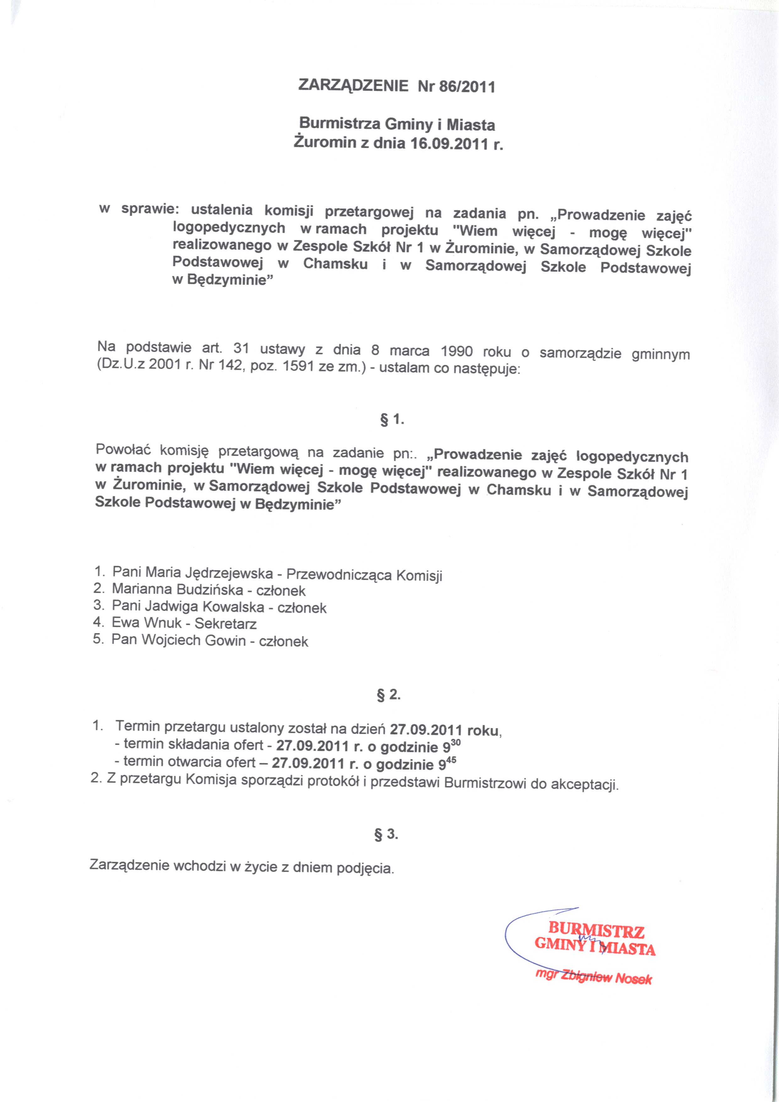 Zarządzenie Nr 86/2011 z dnia 16.09.2011 Burmistrza Gminy i Miasta Żuromin w sprawie ustalenia komisji przetargowej na zadania pn. ”Prowadzenie zajęć logopedycznych w ramach projektu „Wiem więcej – mogę więcej” realizowanego w Samorządowej Szkole Podstawowej w Chamsku oraz Samorządowej Szkole Podstawowej w Będzyminie”.