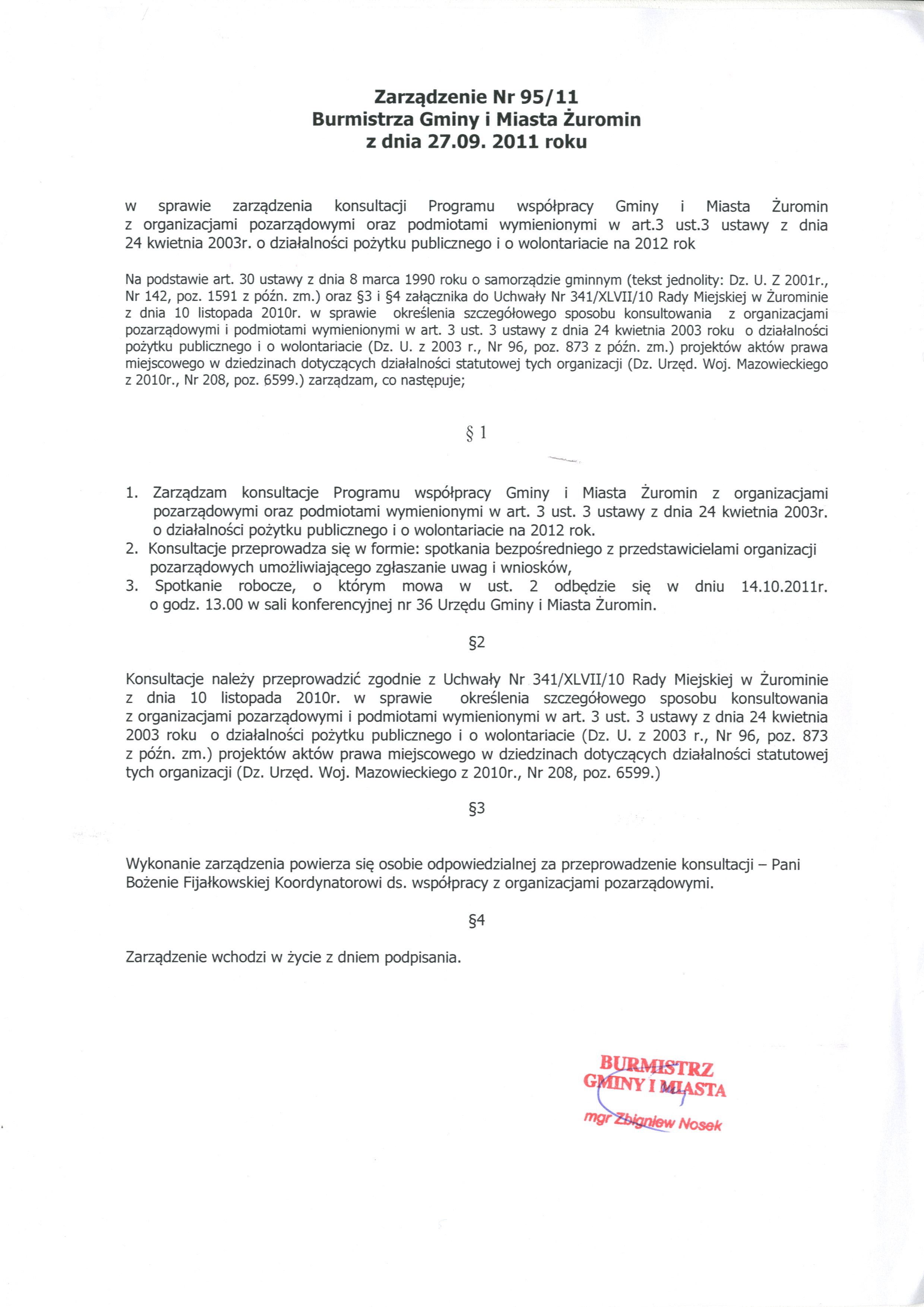 Zarządzenie Nr 95/2011 z dnia 27 września 2011 roku Burmistrza Gminy i Miasta Żuromin w sprawie zarządzenia konsultacji Programu współpracy Gminy i Miasta z organizacjami pozarządowymi oraz podmiotami wymienionymi w art. 3 ust. 3 ustawy z dnia 24 kwietnia 2003r. o działalności pożytku publicznego i o wolontariacie na 2012 rok.