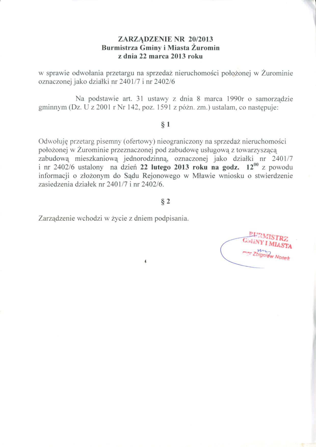 Zarządzenie nr 20/2013 z dnia 22 marca 2013 roku Burmistrza Gminy i Miasta Żuromin w sprawie odwołania przetargu na sprzedaż nieruchomości położonej w Żurominie oznaczonej jako działka nr 2401/7 i nr 2402/6.