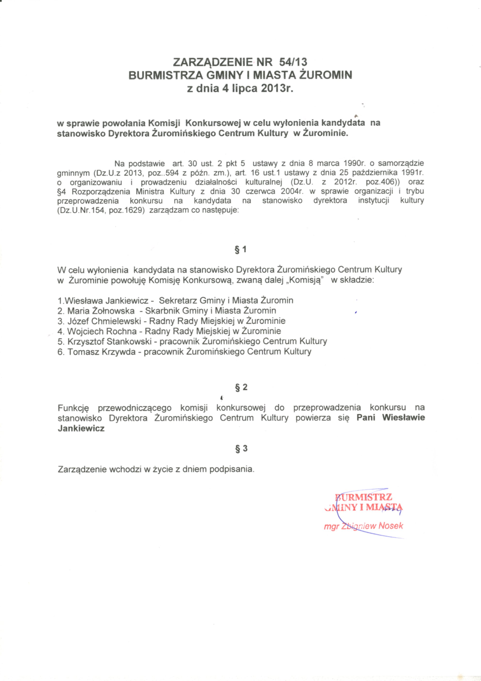 Zarządzenie nr 54/2013 z dnia 4 lipca 2013 roku Burmistrza Gminy i Miasta Żuromin w sprawie powołania Komisji Konkursowej w celu wyłonienia kandydata na stanowisko Dyrektora Żuromińskiego Centrum Kultury w Żurominie.