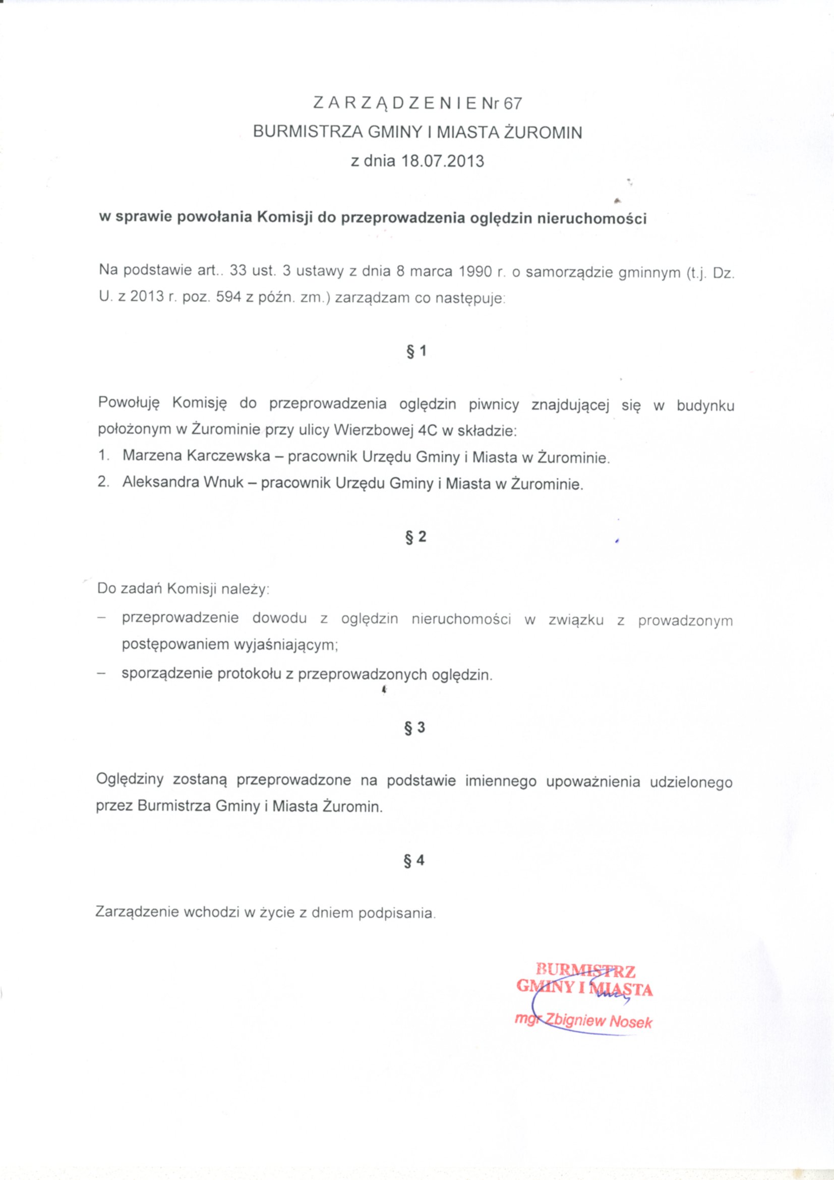Zarządzenie nr 67/2013 z dnia 18 lipca 2013 roku Burmistrza Gminy i Miasta Żuromin w sprawie powołania Komisji do przeprowadzenia oględzin nieruchomości.