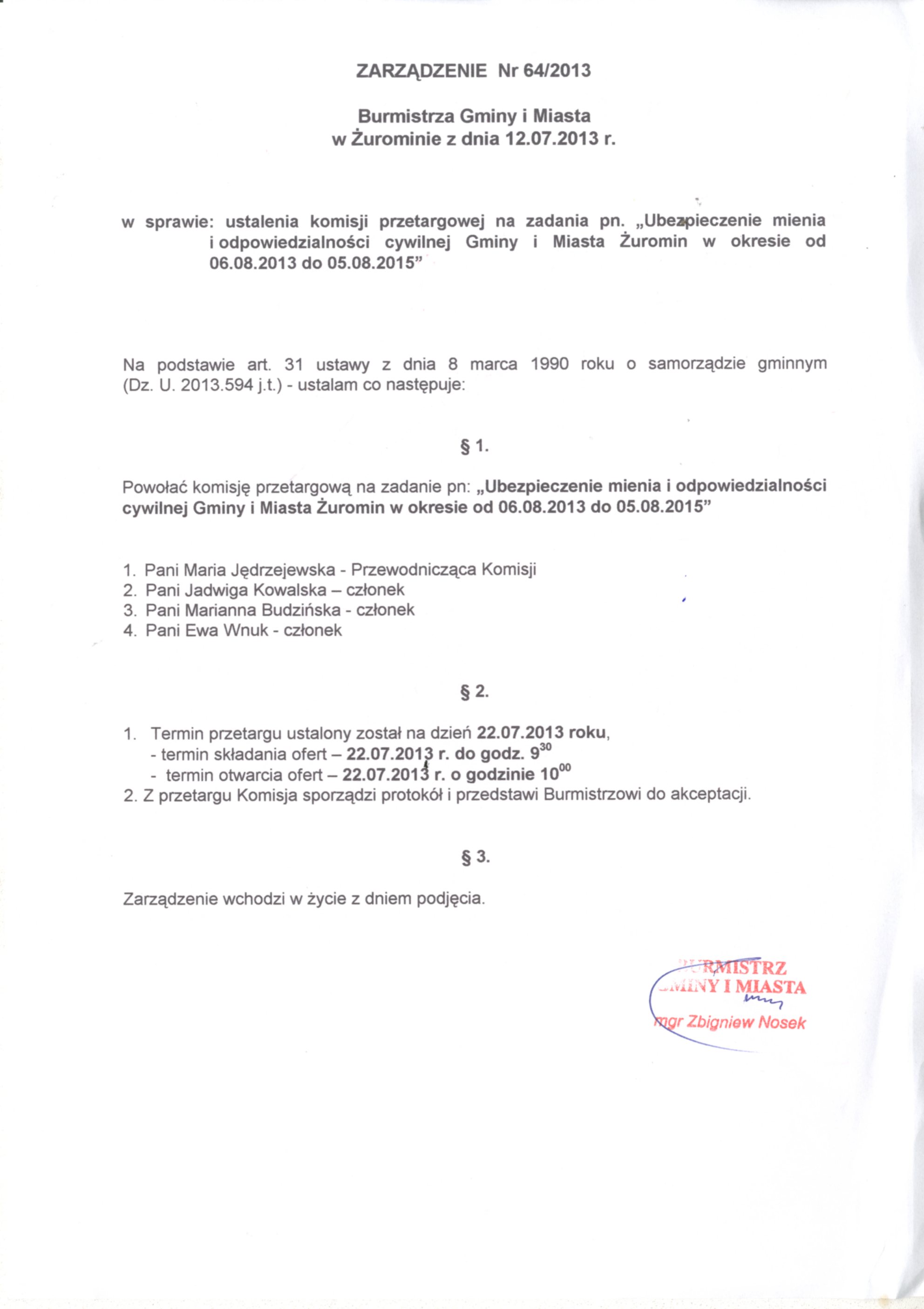 Zarządzenie nr 64/2013 z dnia 12 lipca 2013 roku Burmistrza Gminy i Miasta Żuromin w sprawie ustalenia komisji przetargowej na zadania pn. „Ubezpieczenie mienia i odpowiedzialności cywilnej Gminy i Miasta Żuromin w okresie od 06.08.2013 do 05.08.2015 ”.